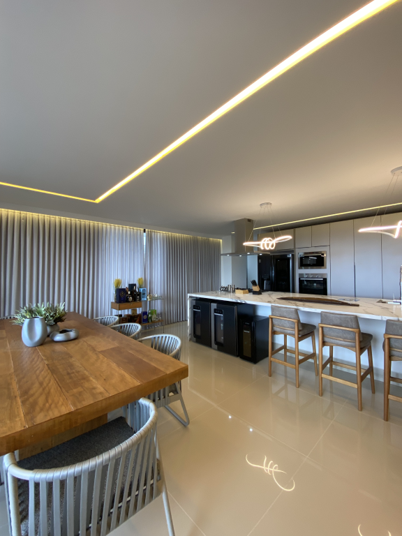 Tudo foi pensando no mínimo detalhe e planejado com todo cuidado. Integramos sala e cozinha, retirando a parede que dividia os dois espaços, adicionando uma bancada, porém a parte elétrica vinha do diretamente do forro. Então tivemos que criar uma canaleta de inox embutida no piso para levar energia para a ilha central. Adicionamos uma bancada de ilha onde colocamos pontos estratégicos de tomada em formato de torre para atender a parte da cozinha e uma torre para a parte dos bancos.
